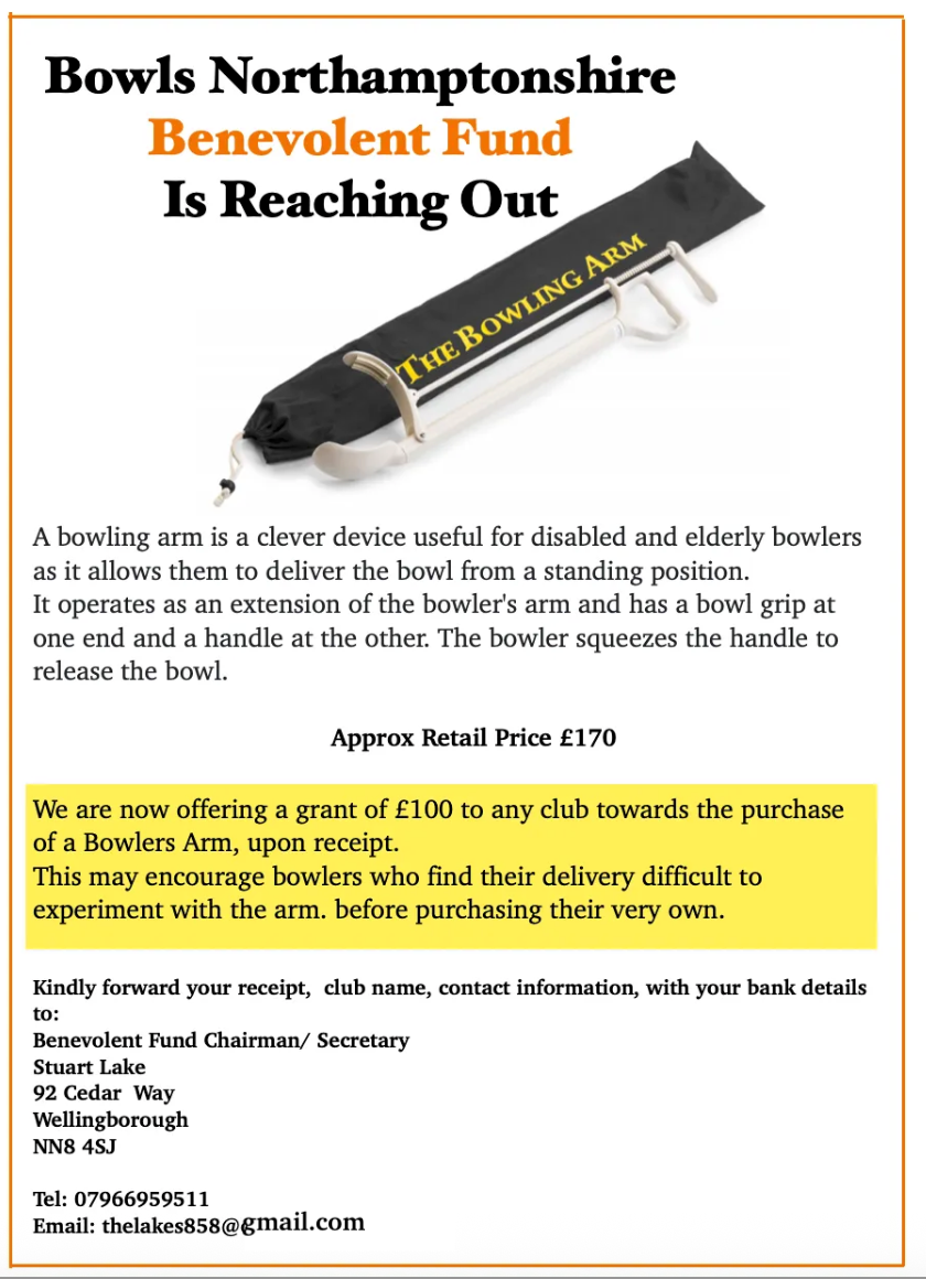 The BN Benevolent Fund offers all clubs a grant of £100 towards a Bowlers Arm.