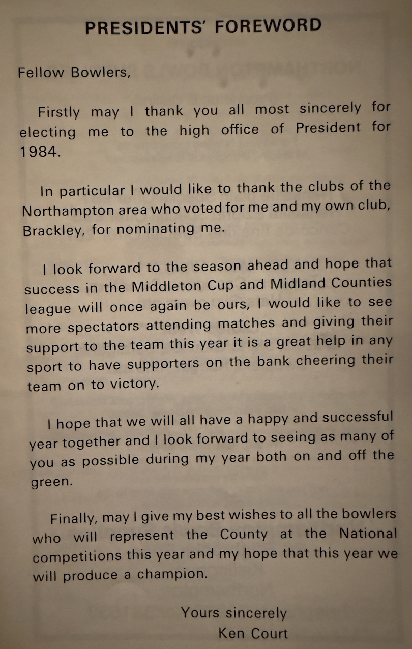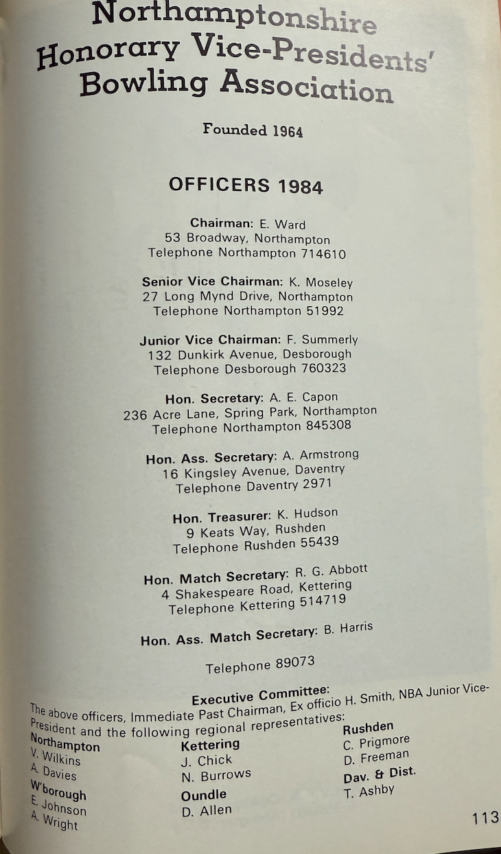 | 1984 | England International Trialist | E.P. Tredwell | Kingsthorpe BC |