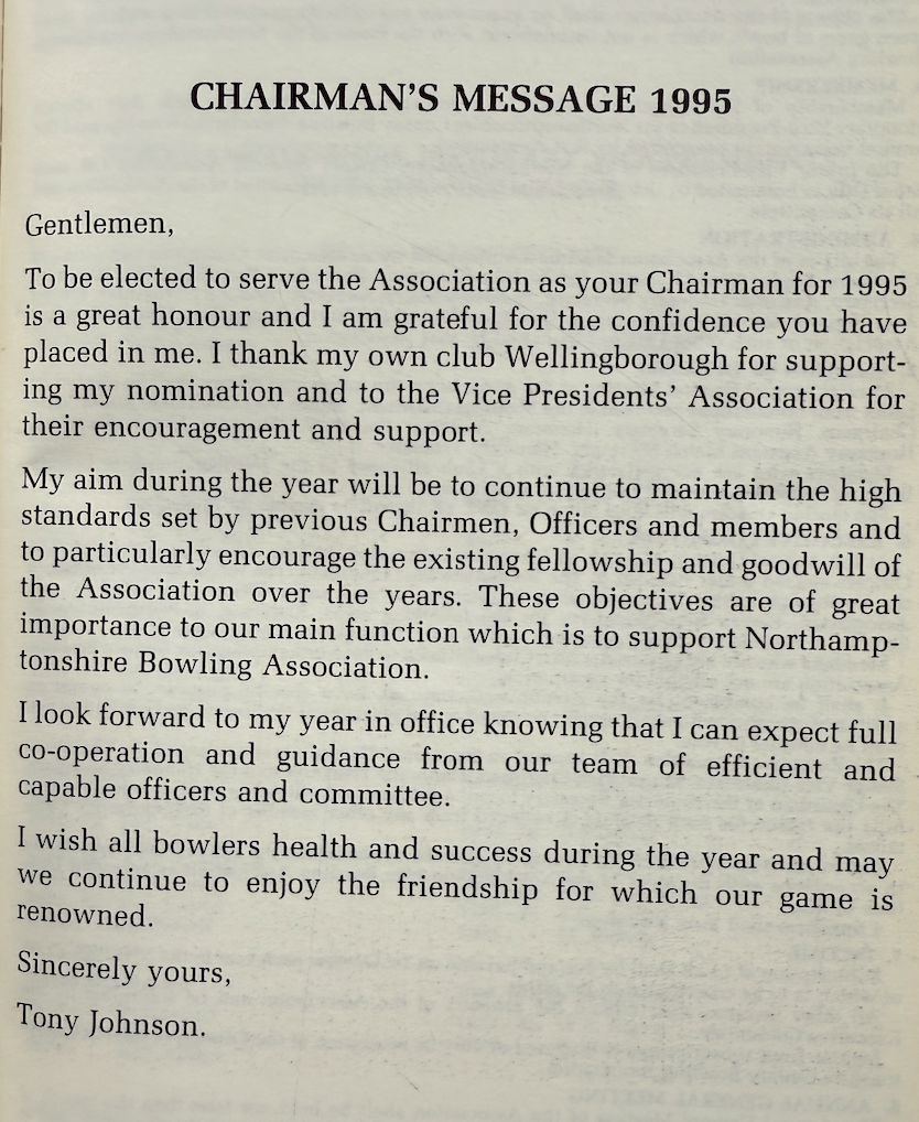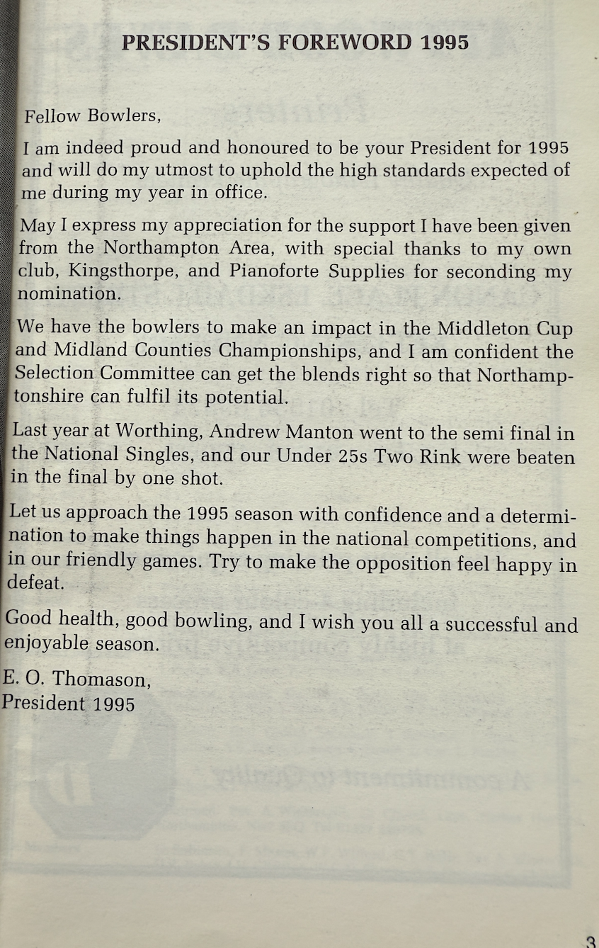 | 1995 | Under 25 England Internationals | N.D. McKee | Kingsthorpe BC |