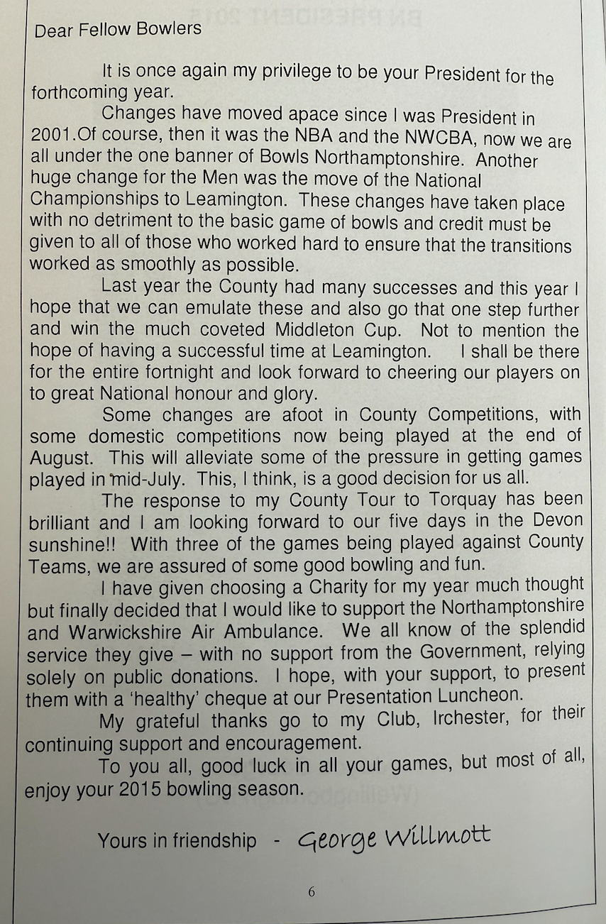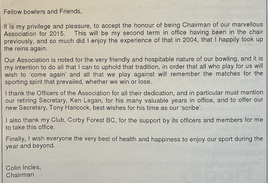 | 2015 | Pairs Champions | Runners-up | P. Broderick & P. Exley | Burton Latimer BC |